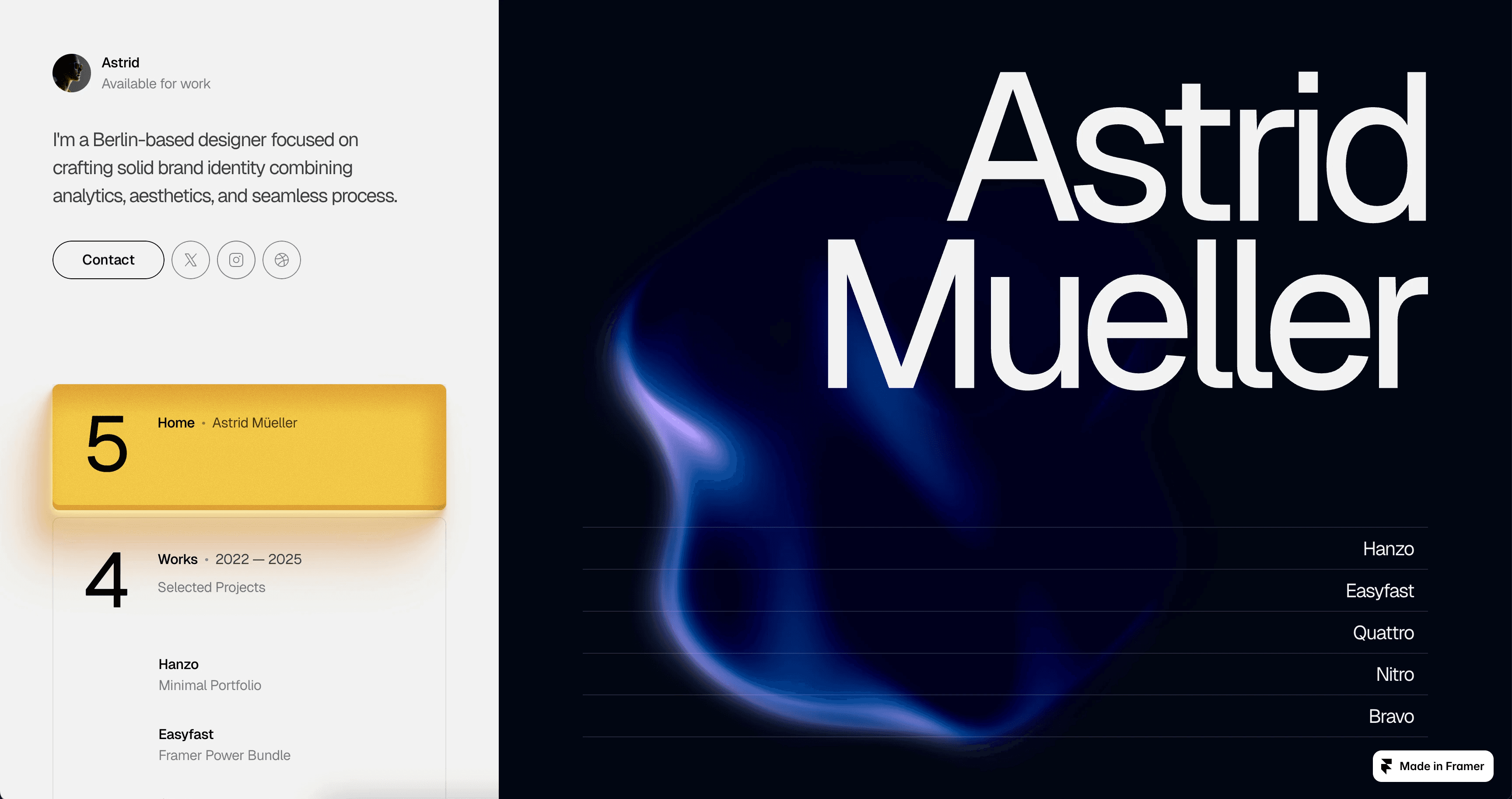 It’s also essential to have an online artist portfolio in a time when clients, gallery visitors, collaborators – even curious browsers – expect a peek behind the creative curtain to commission work. That holds true across artistic mediums: from painters and traditional fine artists to commercial graphic designers, mixed-media creatives, and local tattoo artists. See Why choose Framer for portfolio website building?.