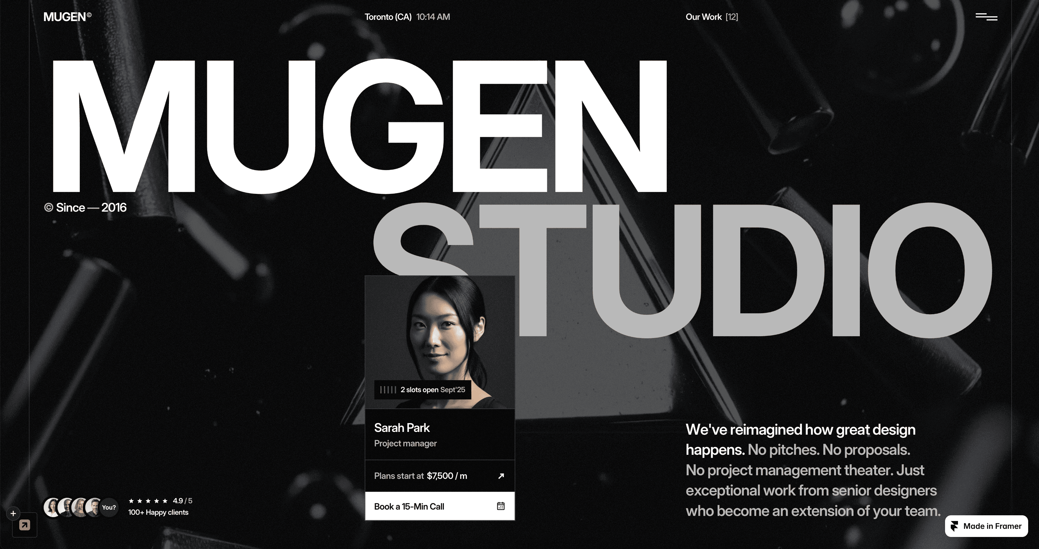 Mugen is one of the few artist website examples designed to earn creatives retainer work. Standout features include a case study-oriented design to better highlight the process and results of your art, plus thoughtful commercial and conversion-focused details. Using Mugen as your online portfolio makes for an exceptional digital business card. Especially when its retainer purposefulness gets paired with its dramatic black color scheme, modular layout, sharp page transitions, and a distinct visual hierarchy.
