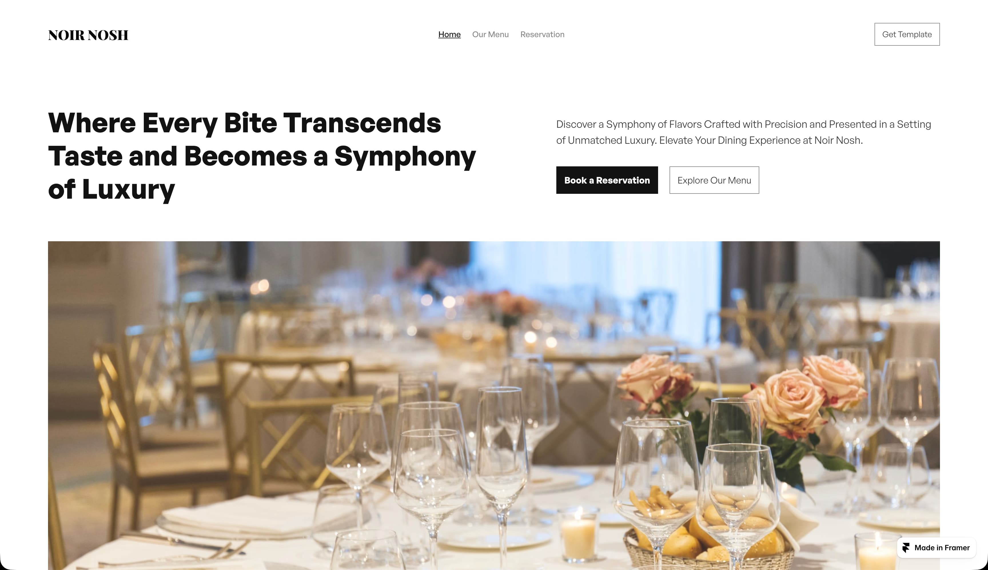 NoirNosh turns sophistication up to 11 with its black-and-white palette and refined typography. This template is less casual dining and more “here’s the ideal wine pairing we recommend with this entrée.”