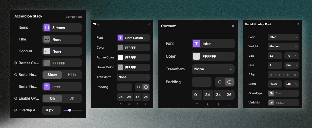 A modern accordion with overlapping titles, smooth motion, and full styling control — perfect for editorial, portfolio, and high-end landing pages.