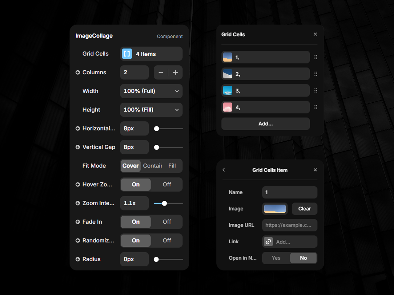 A fully customizable image grid with random ordering, adjustable gaps, hover zoom, fade-in loading, null-image support, and per-image links. Great for product showcases, portfolios, and collage-style layouts.